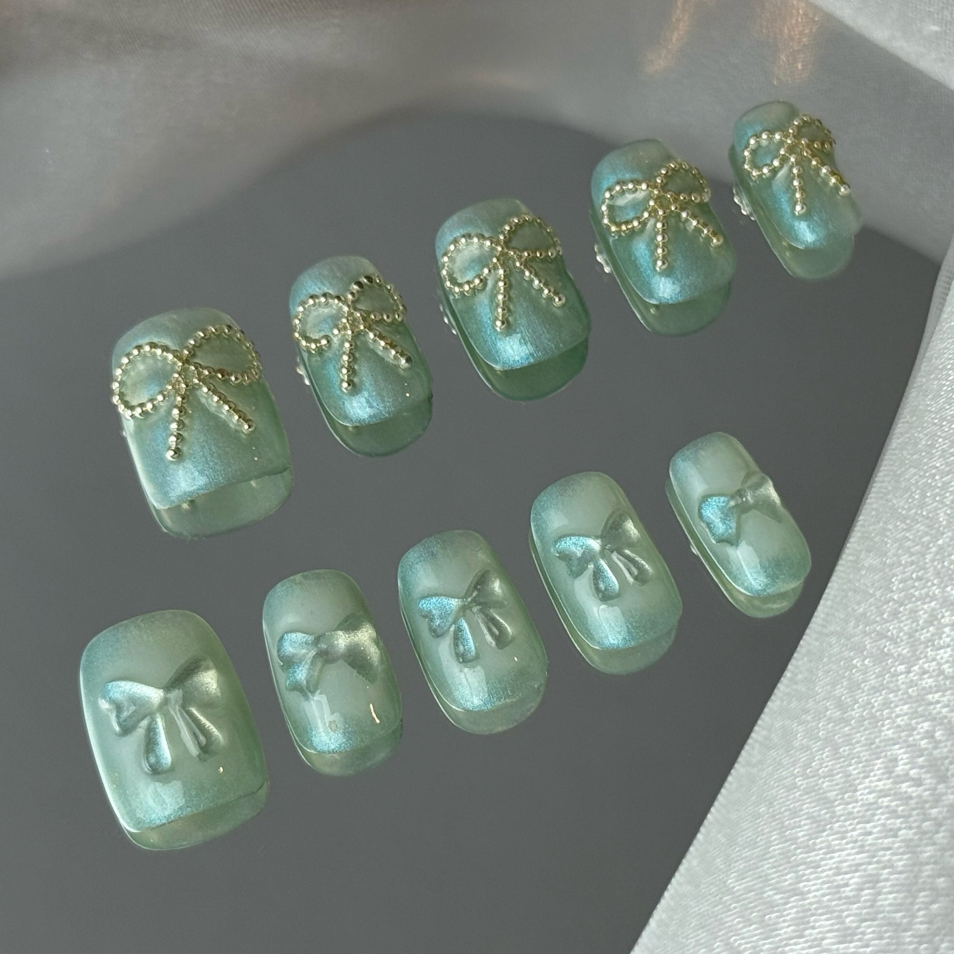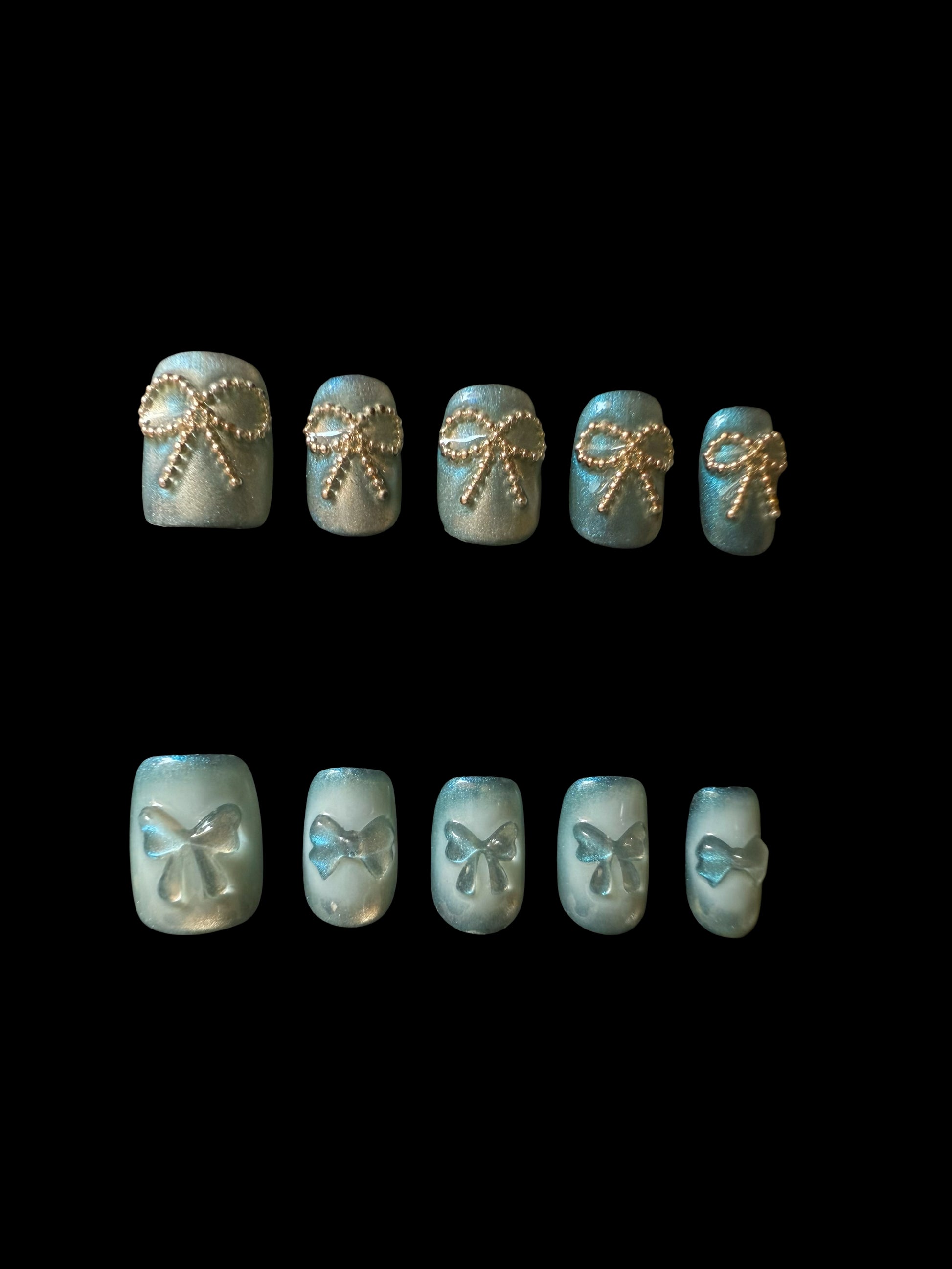 The top row is a three-dimensional bow outlined with metallic beaded chain, as eye-catching as a glittery ribbon;The bottom row is a jelly translucent embossed bow, light and dreamy, like a natural halo of melting snow.